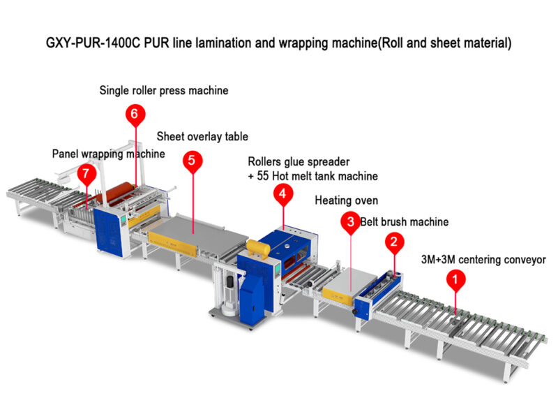 A PUR laminating machine is an industrial system designed to apply PUR reactive hot melt adhesive onto substrates such as MDF, particle board, plywood, PVC film, PET film, veneer, aluminum profiles, and composite materials. After application, the machine bonds decorative films or sheets onto the substrate under controlled pressure and temperature.
