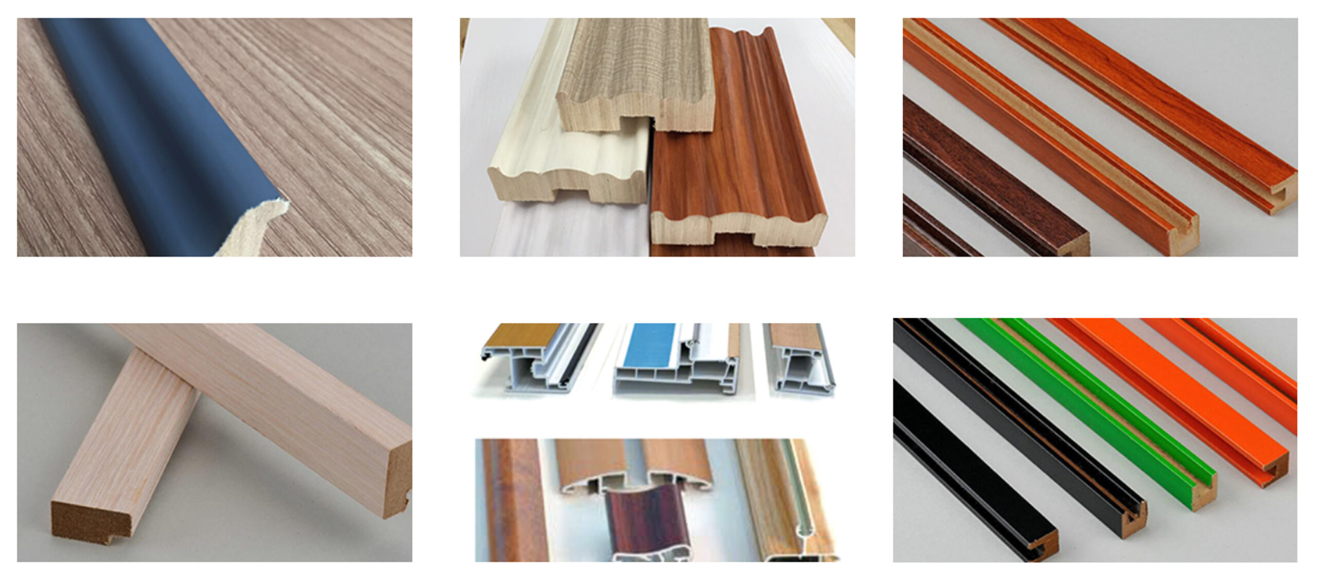 This 450 PUR glue profile wrapping machine line adopts the latest international gluing technology, special coating PUR glue, can cover non-woven wood, PVC, CPL, decorative paper and other surfaces on wood lines, aluminum profiles, steel profiles and other concave and convex surfaces. Widely used in doors and Windows, building materials, furniture, picture frame, decoration and other industries.